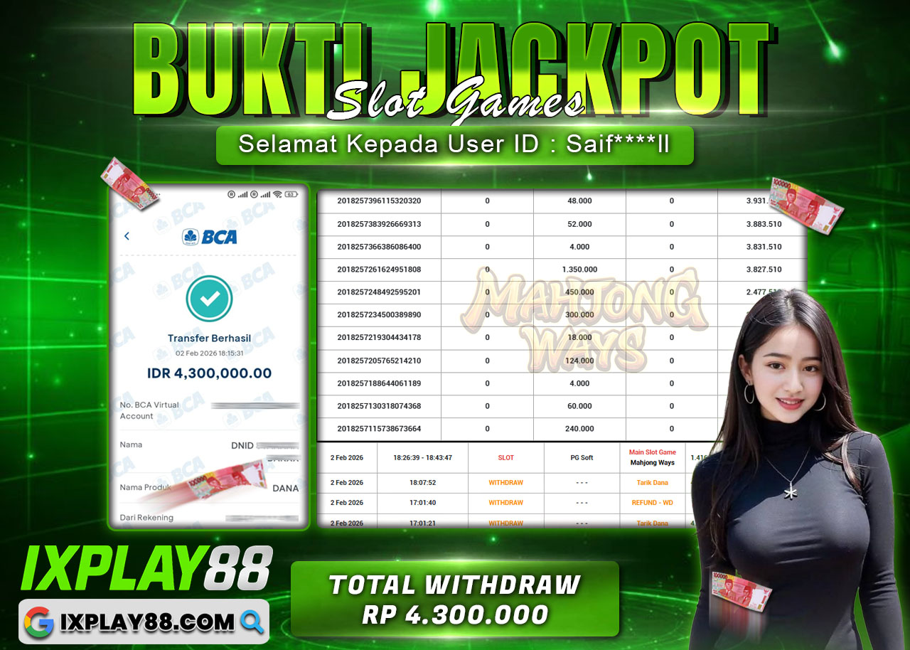 IXPLAY88 kembali menampilkan bukti transaksi terbaru. User ID Saif*ll berhasil melakukan withdraw Rp4.300.000 dari permainan Mahjong Ways. Detail riwayat permainan dan notifikasi transfer menunjukkan proses penarikan tercatat jelas, nominal sesuai, dan berjalan tanpa kendala.